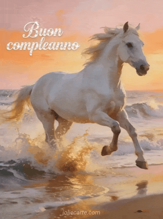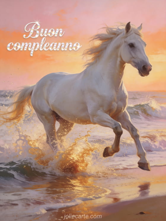 Questo straordinario biglietto di compleanno per uomini mostra un magnifico cavallo bianco che galoppa tra onde dorate su una spiaggia all'alba, con la criniera al vento su uno sfondo rosa e arancione. Un biglietto potente e libero per celebrare il giorno speciale di ogni uomo. Scopri anche un biglietto di buon compleanno uomo gratis o un testo biglietto compleanno uomo.