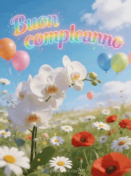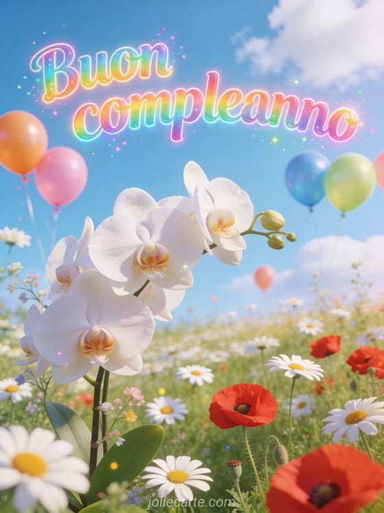 Festeggia con un bel biglietto virtuale compleanno bambino con orchidee bianche in un prato fiorito di margherite e papaveri, palloncini nel cielo azzurro e luce calda di primavera. Scopri anche cyber biglietti compleanno bambino, biglietto compleanno bambino gratis e striscione buon compleanno bebè.