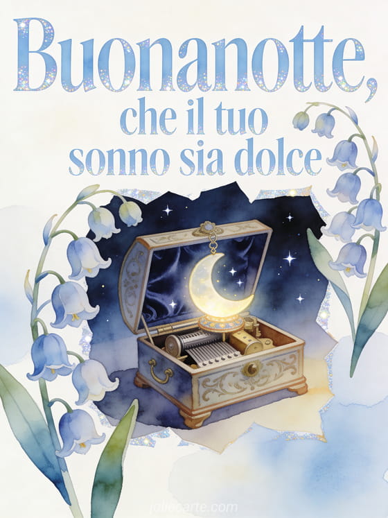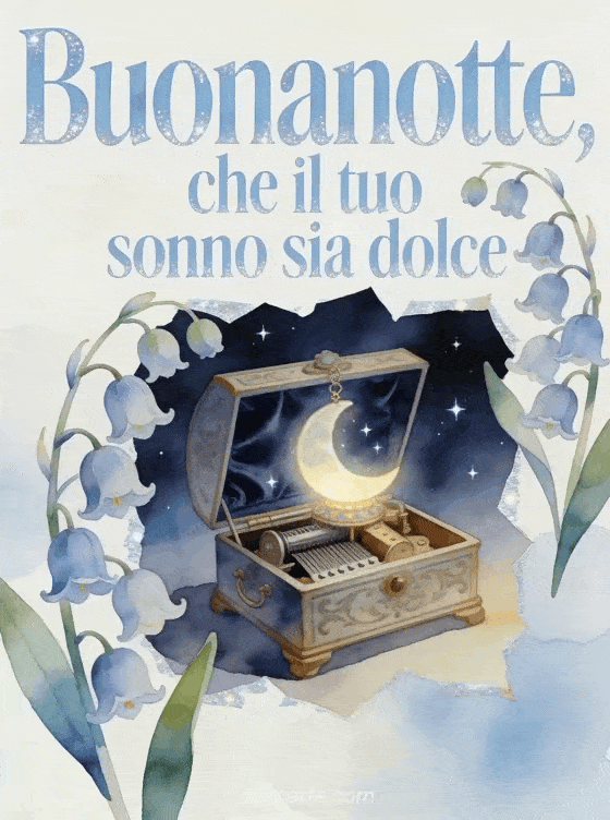 Condividi un messaggio delicato di buonanotte con scritte azzurro pallido ad acquerello, bordi scintillanti, campanelle di giacinto e foglie, un carillon antico, un ornamento lunare luminoso, cielo notturno vellutato e piccole stelle. Puoi inviare anche un messaggio per dire buonanotte, un messaggio della buonanotte per un'amica o un piccolo messaggio di buona notte.
