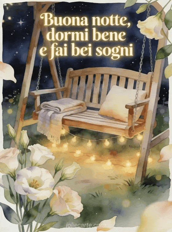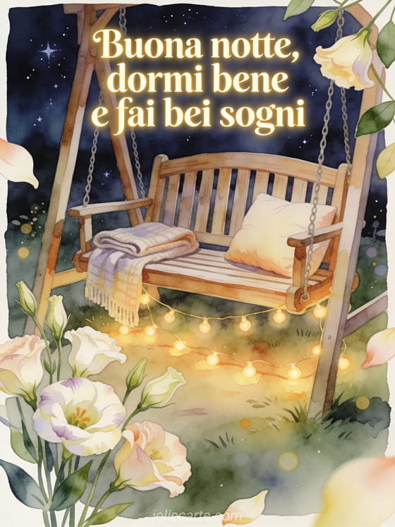 Condividi un biglietto sereno di buona notte con un'altalena di legno in giardino, una coperta piegata, un cuscino morbido, luci a filo e fiori di lisianto sotto un cielo stellato. Puoi anche inviare un messaggio per augurare buonanotte a sua moglie, un messaggio per augurare buonanotte alla sua fidanzata o un biglietto buona notte gratis.