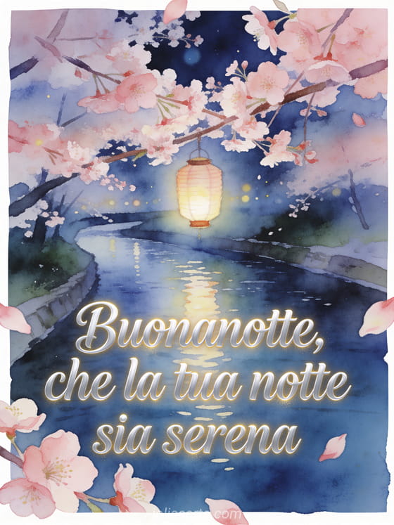 Invia un messaggio sereno della buonanotte con un fiume lento, luce di lanterne sospese e fiori di ciliegio in primo piano. Scopri anche messaggio della buonanotte per il suo uomo, messaggio dolce della buonanotte o messaggio di buonanotte per la sua ragazza.