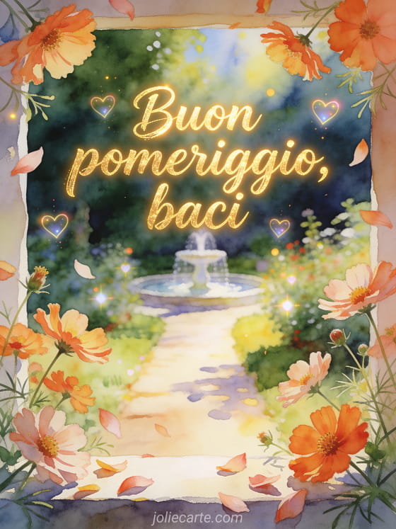 Condividi un biglietto luminoso del pomeriggio con scritta dorata, petali di cosmos oltre il bordo, un sentiero assolato in giardino, una piccola fontana e scintille a forma di cuore. Puoi inviare anche baci del pomeriggio, amicizia buon fine pomeriggio baci o buon pomeriggio a te.