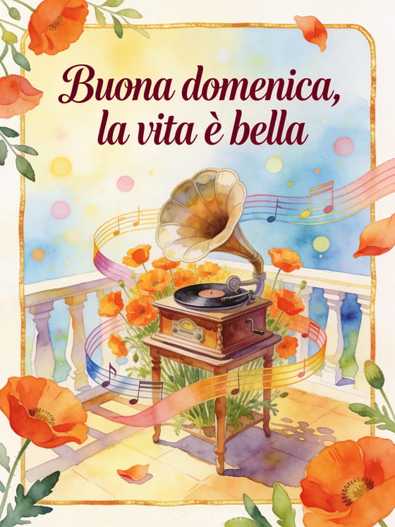 Condividi buona domenica, la vita è bella con lettere bordeaux, un grammofono vintage su una veranda soleggiata, papaveri luminosi e nastri musicali colorati. Scopri anche buona domenica cuore gif, buongiorno domenica immagini o immagini buonissima domenica.