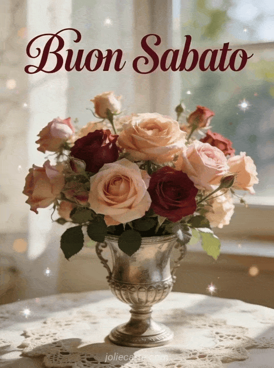 Condividi un elegante augurio del sabato con questa bella cartolina con rose da giardino in un vaso argentato antico. Scopri anche una cartolina buongiorno buon sabato e buon fine settimana o una cartolina sabato buona giornata.