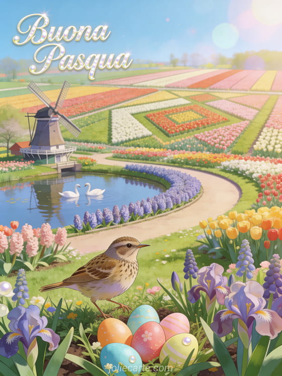 Condividi una bellissima cartolina di Buona Pasqua con un pipit che salta tra uova colorate in un giardino di tulipani. Scopri anche una cartolina di Pasqua gratuita o auguri buona Pasqua.