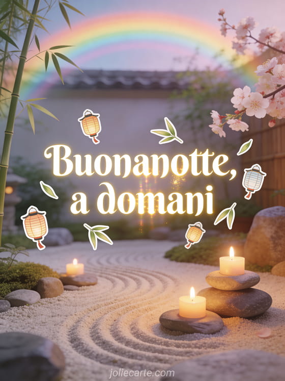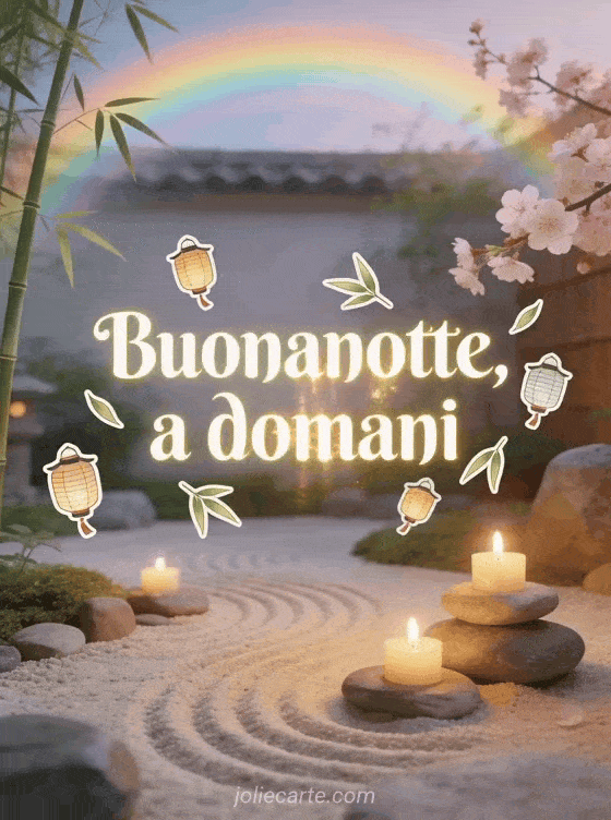 Condividi una tranquilla buonanotte con questo bel biglietto con un giardino zen con sabbia rastrellata e pietre, lanterne giapponesi, candele accese, fiori di ciliegio e un arcobaleno nella calda luce rilassante. Scopri anche un messaggio buonanotte divertente, foto della buona notte o un pensiero della buona notte.