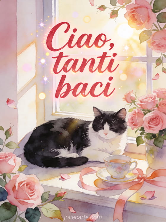 Condividi un ciao caldo con scritte rosso rosa ad acquerello, un gatto bianco e nero vicino a una luminosa nicchia della finestra, rose rosa, una tazza di porcellana, nastri e raggi di sole. Scopri anche un biglietto ciao vita, un biglietto ciao coniglietto o un biglietto mattino un piccolo saluto baci.
