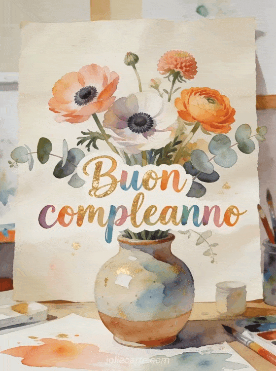 Festeggia con una bella cartolina di compleanno animata gratis con testo acquerello, anemoni, ranuncoli ed eucalipto in stile atelier. Scopri anche cartolina compleanno animata, immagine animata buon compleanno e compleanno animato.