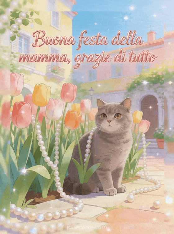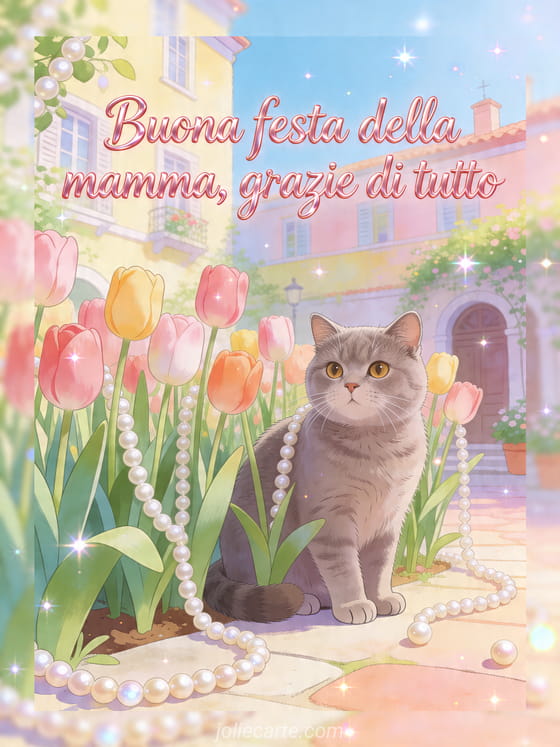 Condividi una bella frase buona festa della mamma per una mamma con scritta rosa a mano e un'illustrazione fiabesca di un gatto british shorthair tra alti tulipani e ghirlande di perle in un cortile allegro. Questo biglietto caloroso dice grazie di tutto. Scopri anche ode per la festa della mamma, componimenti per la festa della mamma o messaggi della festa della mamma.