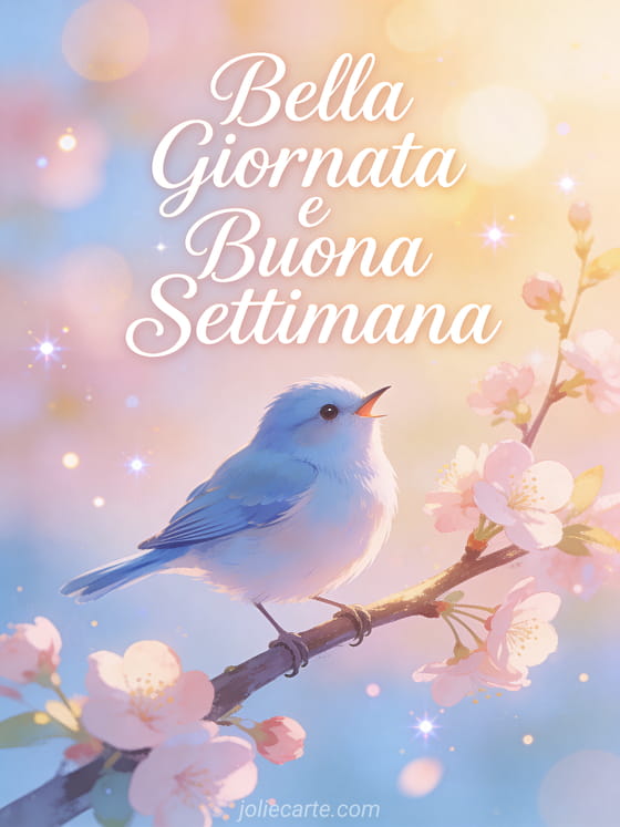 Invia un augurio di bella giornata e buona settimana per illuminare il mattino di qualcuno. Un delicato uccellino azzurro che canta su un ramo fiorito crea un'atmosfera primaverile e gioiosa. Scopri anche un buona settimana buona giornata o un gif buona settimana umorismo.