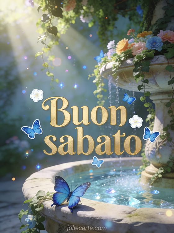 Invia un saluto incantevole di buon sabato con eleganti scritte dorate antiche, fiori bianchi, farfalle blu e una vecchia fontana coperta d'edera con acqua cristallina e farfalla morpho blu. Puoi vedere anche questa buongiorno buon sabato buona giornata, questi buon sabato e buon weekend baci o questa buon sabato buon weekend immagine.