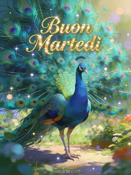 Illumina il martedì di qualcuno con questa elegante cartolina con un magnifico pavone che sfoggia il suo stupendo piumaggio iridescente turchese e verde. Scopri anche una cartolina immagine buon martedì, una cartolina gif buon martedì baci o una cartolina caffè buon martedì soleggiato.