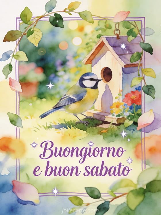 Condividi un messaggio luminoso del sabato mattina con una cinciallegra vicino a una piccola casetta per uccelli in un angolo colorato di giardino. Puoi inviare anche una buon sabato donna immagine, un buon sabato caffè gif o una buon sabato a tutti immagine.