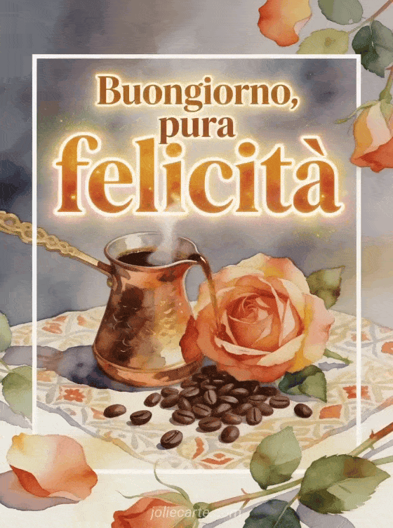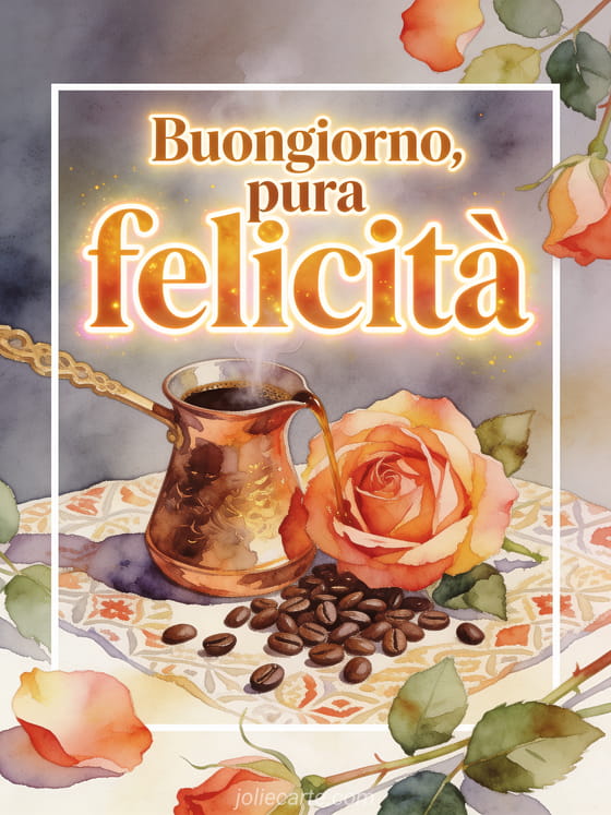 Condividi un ricco momento del mattino con questo biglietto ad acquerello, con un cezve di rame, aroma di caffè, una rosa aperta e chicchi su tessuto decorato. Scopri anche buongiorno buon caffè, buongiorno caffè baci gif o buongiorno caffè cuore gif.