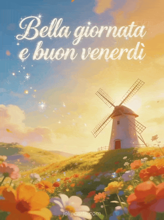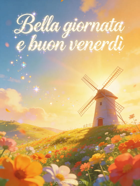 Condividi una bella immagine di buon venerdì con scritte avorio fluide, una collina soleggiata, un mulino classico e fiori luminosi con delicata luce scintillante. Scopri anche buon venerdì sole gif, immagine di buon venerdì con fiori o buon venerdì invernale gif.