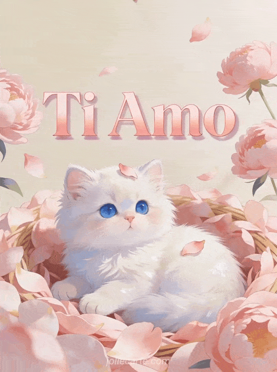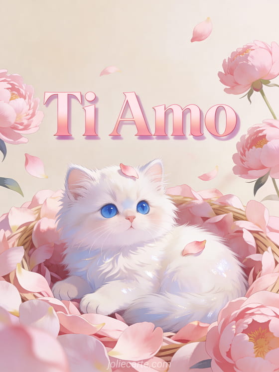 Esprimi il tuo amore con questa adorabile cartolina Ti Amo con un gattino persiano bianco dagli occhi azzurri tra petali di peonia rosa. Scopri anche una cartolina d'amore carina o una cartolina ti amo animata.