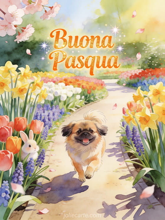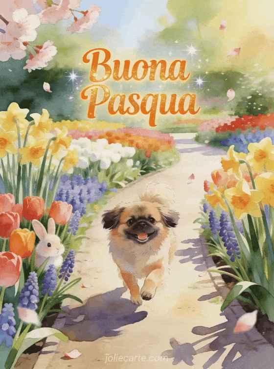 Scopri queste belle cartoline di Pasqua gratis con un coniglio, cane pechinese e fiori primaverili. Scopri anche gif baci Pasqua o buona Pasqua immagine.
