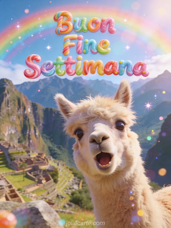 Fai ridere qualcuno questo fine settimana con questa divertente cartolina con un alpaca peloso che fa photobomb in una scenica scena di montagna. Scopri anche umorismo buon fine settimana o immagine buon fine settimana.