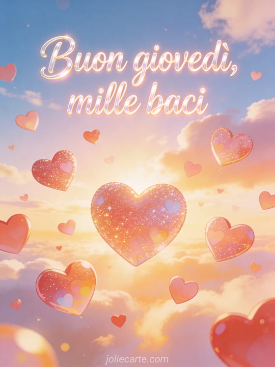 Condividi mille baci di buon giovedì con corsivo delicato, bagliore lucido, molti cuori sospesi in un cielo radioso del mattino, glitter soffice e una palette calda. Scopri anche buon giovedì cane immagine, buon giovedì gatto gif o buon giovedì donna immagini.