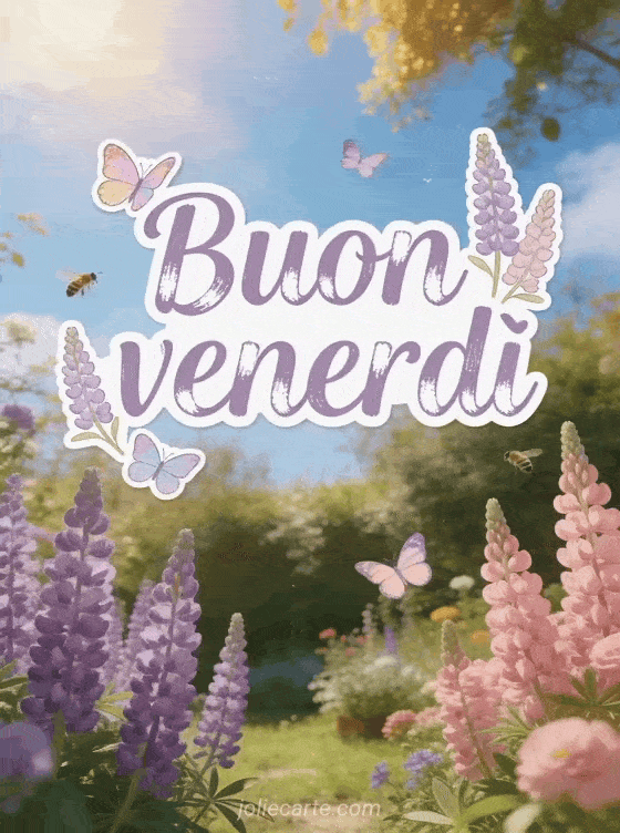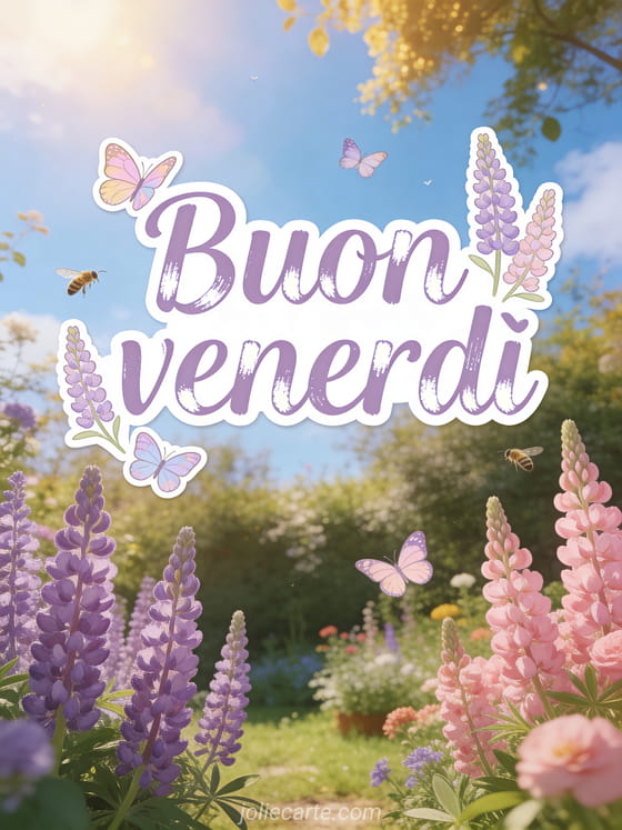 Augura un buon venerdì con un giardino di campagna colorato, lupini in fiore, farfalle pastello, api e luce dorata. Scopri anche un buon venerdì umorismo gif, un buonissimo venerdì o un buongiorno buona giornata di venerdì baci.