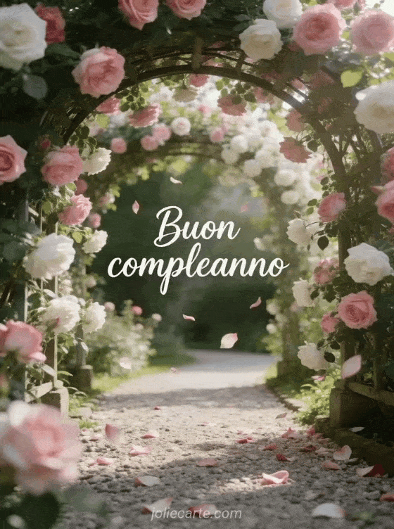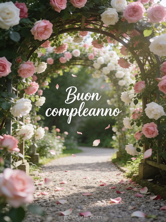 Deliziale con questo incantevole biglietto di compleanno con un pergolato coperto di rose in piena fioritura. Scopri anche un buon compleanno donna testo o un biglietto compleanno donna natura.