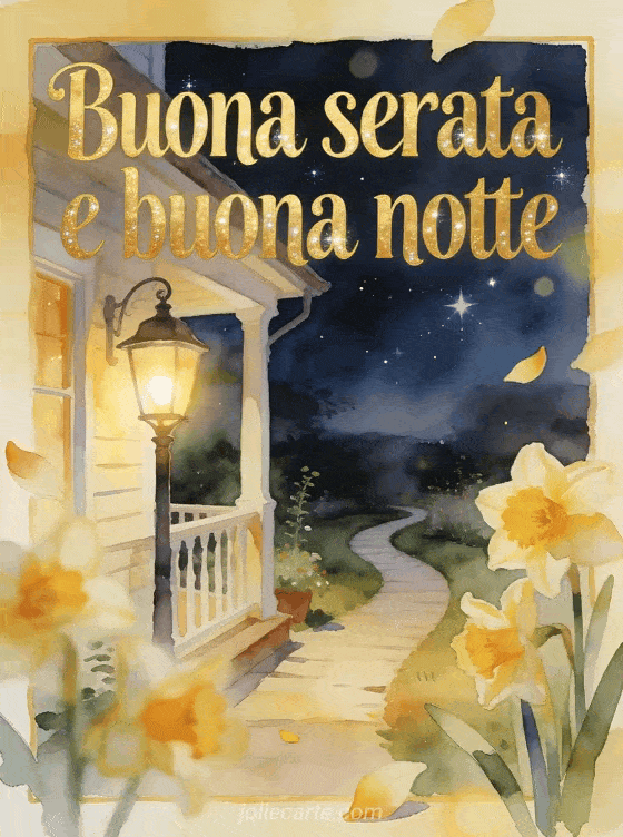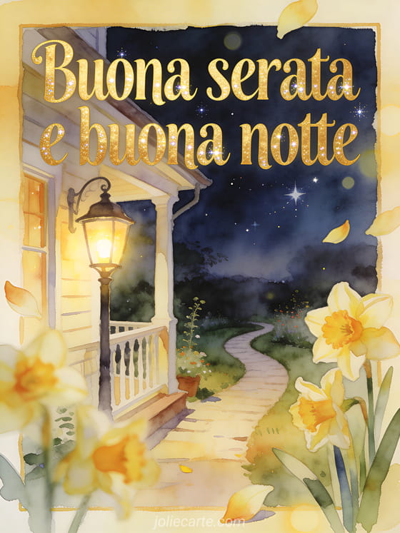 Condividi buona serata e buona notte con un biglietto ad acquerello che mostra un sentiero in giardino, una lanterna da portico accesa, narcisi e le prime stelle. Scopri anche un biglietto di auguri di buona notte, cartoline virtuali animate gratis della buonanotte o splendido messaggio di buonanotte.
