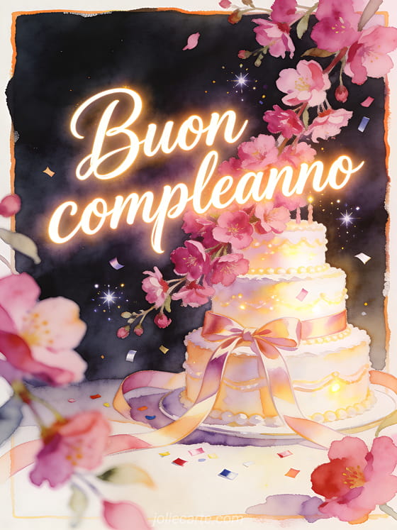 Condividi un biglietto di compleanno gioioso con calligrafia avorio, fiori fucsia a cascata, una torta luminosa a piani, nastri di raso e coriandoli scintillanti. Il bordo ad acquerello e i petali sovrapposti danno al saluto un tono romantico e luminoso. Scopri anche un buon compleanno amore mio gif, compleanno coppia innamorata o compleanno amore mio.