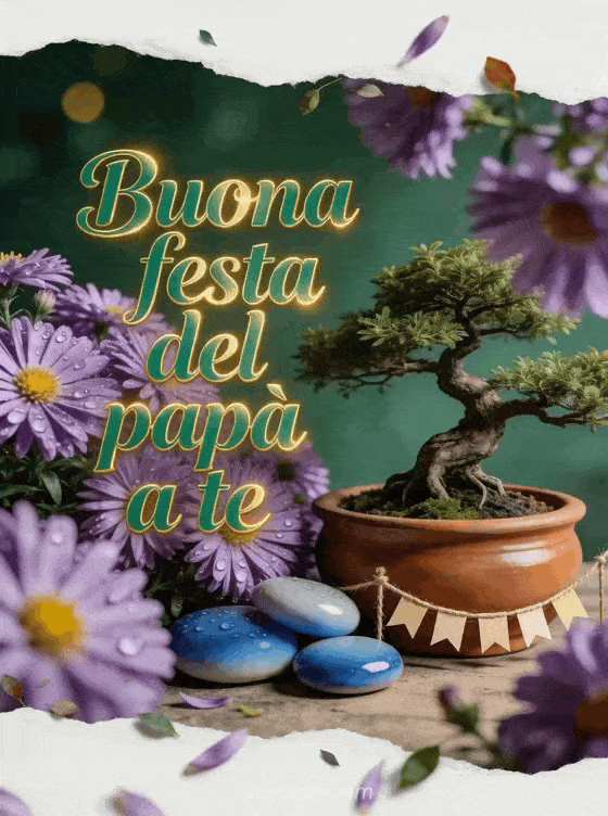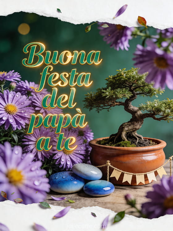 Invia biglietti festa del papĂ con scritta smeraldo sicura, un bonsai realistico accanto ad aster viola, pietre ceramiche lisce e una piccola ghirlanda festiva in un'atmosfera serena e gioiosa. Scopri anche buona festa della mamma e buona festa del papĂ , un buona festa papĂ testo o un biglietto gratis buona festa del papĂ .