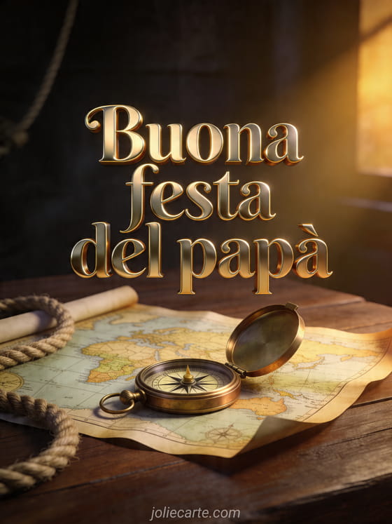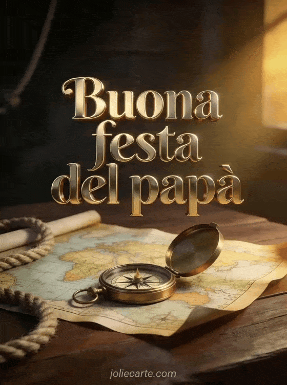 Invia biglietti per la festa del papĂ con lettere dorate metalliche, un'antica bussola in ottone aperta su una carta nautica vintage e una corda da marinaio su un tavolo di legno scuro. Scopri anche un biglietto gratuito festa del papĂ , festa del papĂ a mio figlio o un biglietto per la Festa del PapĂ PS.
