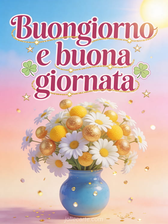 Inizia la giornata con questo luminoso biglietto con un mazzo di ranuncoli e margherite in un vaso blu, quadrifogli portafortuna, cielo azzurro radiante e brillantini dorati. Scopri anche un biglietto di buona giornata con baci o un biglietto di buona giornata con umorismo.