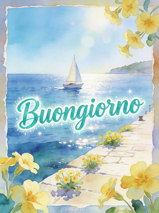 Invia una cartolina gioiosa di buongiorno con scritte fresche color teal ad acquerello, una piccola barca a vela che attraversa una baia azzurra al sole e primule lungo un luminoso molo di pietra. Scopri anche una buongiorno e migliori auguri, un piccolo messaggio per buongiorno o un messaggio di buongiorno al suo caro.