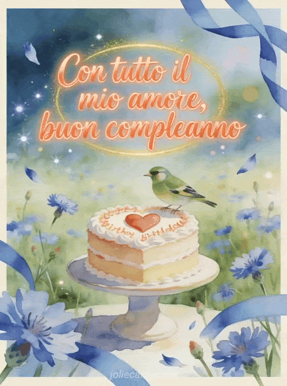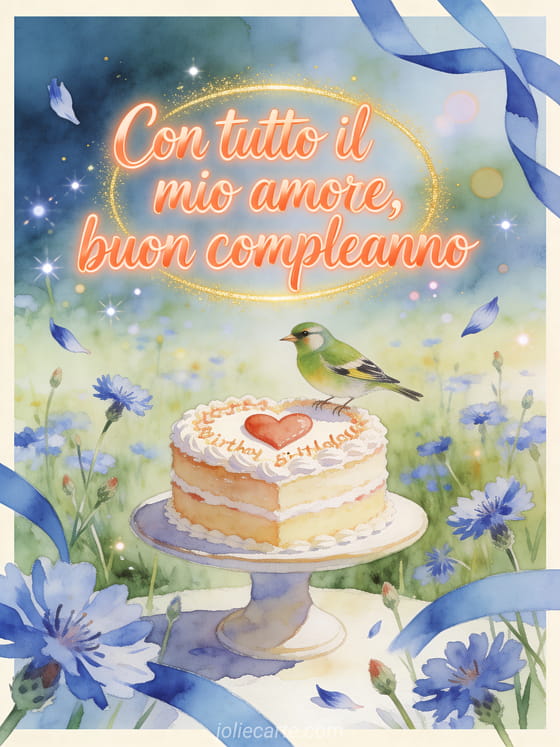 Invia tutto il tuo amore con un biglietto di compleanno in acquerello ambientato in un prato di fiordalisi, con una torta decorata con un cuore, nastri blu, bokeh scintillante e un verdone posato sull'alzata. Personalizzalo online e condividilo gratis. Scopri anche un buon compleanno amore mio immagine, un gif animato buon compleanno cuore mio o messaggi di compleanno per il mio amore.