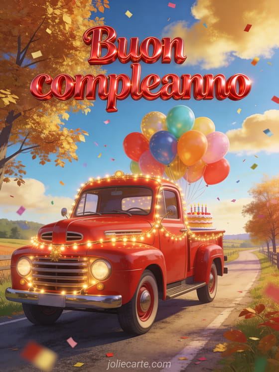 Festeggia con questo biglietto buon compleanno camion con un camion rosso vintage brillante decorato con luci e palloncini su una strada di campagna, con torta di compleanno sul retro e coriandoli nel cielo. Scopri anche buon compleanno amica immagine, amicizia buon compleanno amica e compleanno amica cara.