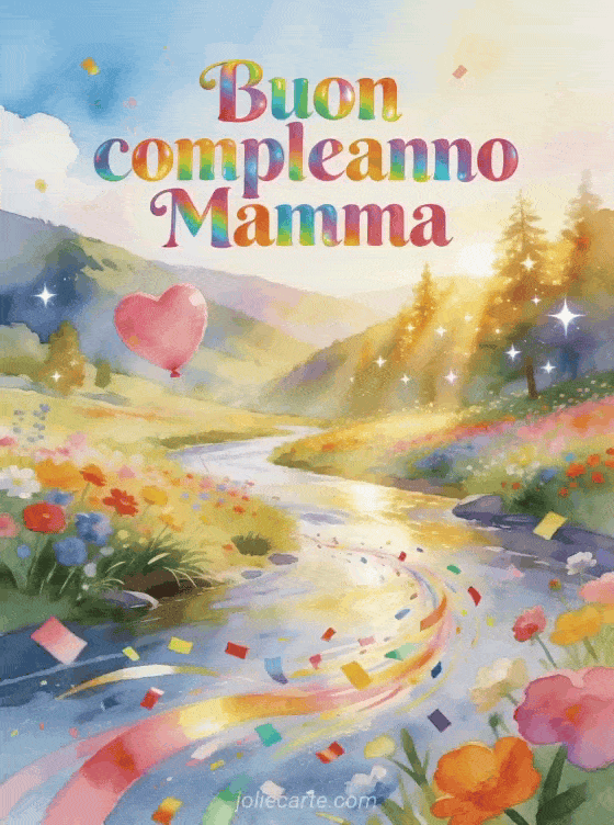 Festeggia il compleanno della tua mamma con questo bellissimo biglietto gratuito con una valle fiorita con fiume, un palloncino rosa a cuore, coriandoli colorati e luce dorata. Un augurio vibrante in acquerello. Scopri anche un immagine di compleanno per mamma o un biglietto animato di compleanno per mamma.