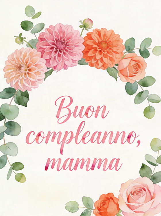 Condividi un affettuoso augurio di compleanno per la tua mamma con questo elegante biglietto floreale con dalie rosa e corallo ed eucalipto su un delicato sfondo crema. Scopri anche messaggio compleanno mamma, biglietto compleanno mamma e buon compleanno mamma.