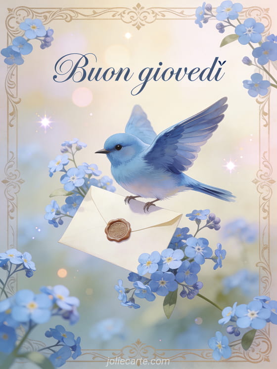 Invia una deliziosa cartolina di giovedì con questa elegante scena vintage di un uccellino blu che porta una lettera sigillata tra non-ti-scordar-di-me. Scopri anche buongiorno buon giovedì baci o buon giovedì grandi baci.