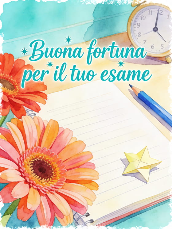 Invia un messaggio concentrato di buona fortuna per l'esame con calligrafia turchese chiara, piccoli lampi di stelle, una matita blu, un piccolo orologio, una stella portafortuna di carta e gerbere vivaci. Puoi condividere anche un testo buona fortuna nuovo lavoro, un messaggio di buona fortuna o un arrivederci e buona fortuna testo.