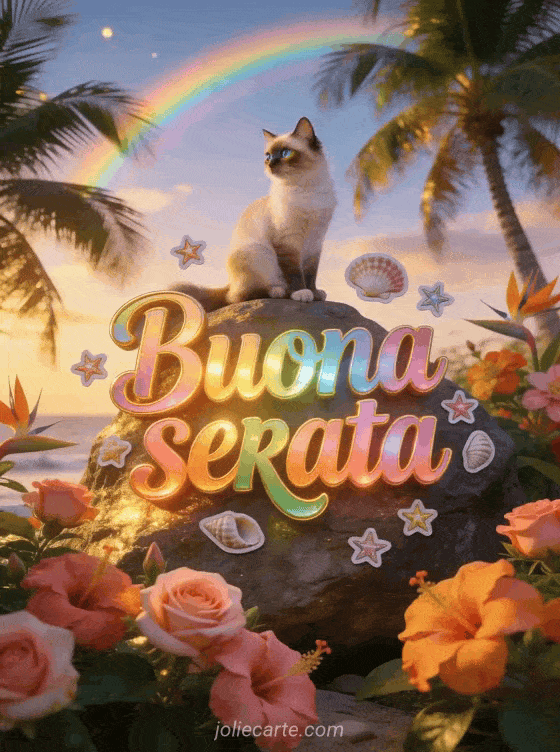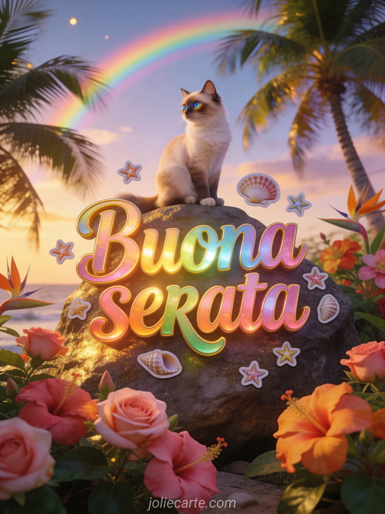Invia un caloroso biglietto animato di buona serata con questa colorata cartolina gratis con un gatto turco di Van in una scena tropicale al crepuscolo. Scopri anche testo per augurare buona sera o buona sera baci.