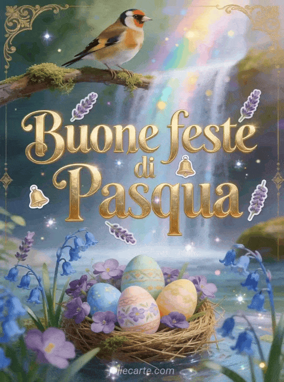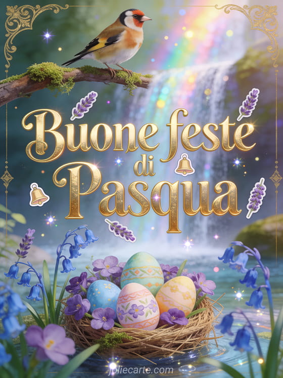 Invia questo incantevole biglietto di buone feste di Pasqua con un fringuello su un ramo muschiato sopra uova di Pasqua dipinte a mano in un nido di fiordalisi e viole, con una dolce cascata e riflessi d'arcobaleno. Scopri anche un biglietto di Pasqua, un biglietto virtuale di Pasqua o un biglietto di auguri pasquali.