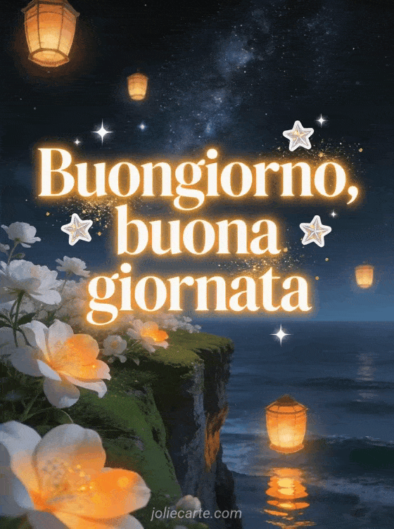 Inizia la giornata con questo incantevole biglietto con fiori bianchi su una scogliera verde affacciata sull'oceano, lanterne fluttuanti in un cielo stellato e la Via Lattea. Scopri anche un biglietto di buongiorno con sole o un biglietto di buona giornata.
