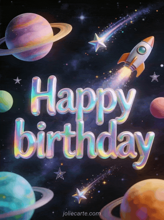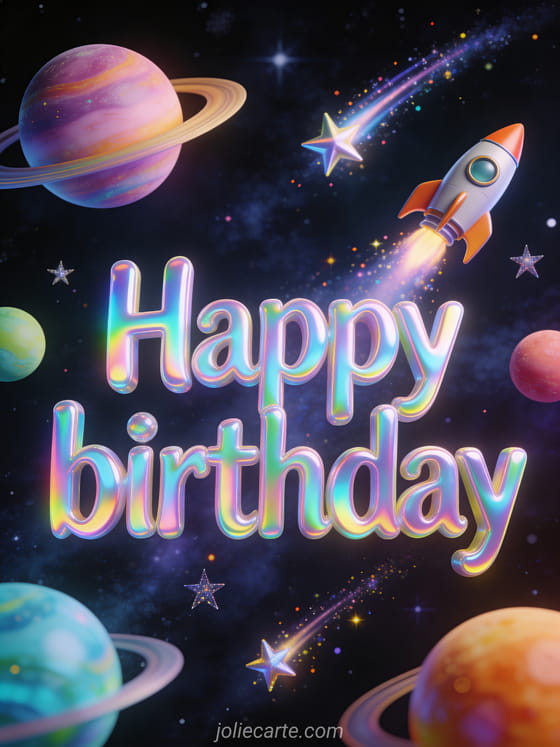 Regala a un adolescente un biglietto di compleanno da un altro mondo. Lettere olografiche iridescenti su sfondo nero stellato, pianeti colorati, un razzo retrò e stelle cadenti creano un'atmosfera spaziale da sogno. Scopri anche un messaggio compleanno per ragazzi o un biglietto buon compleanno adolescenti.