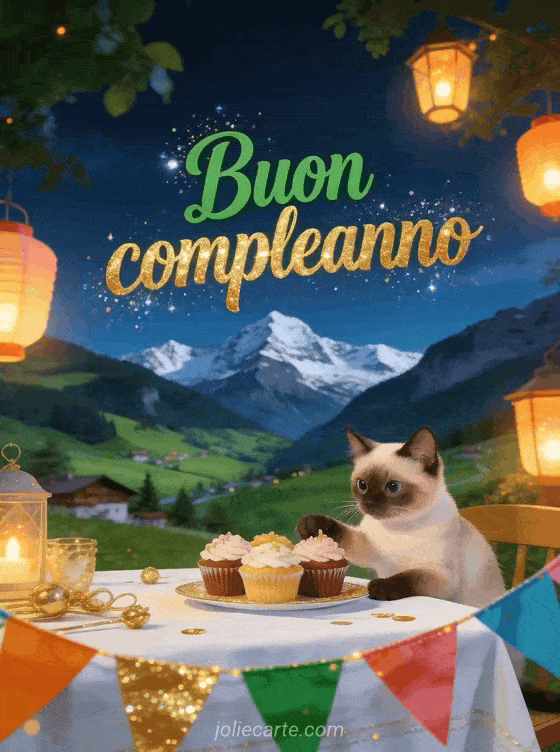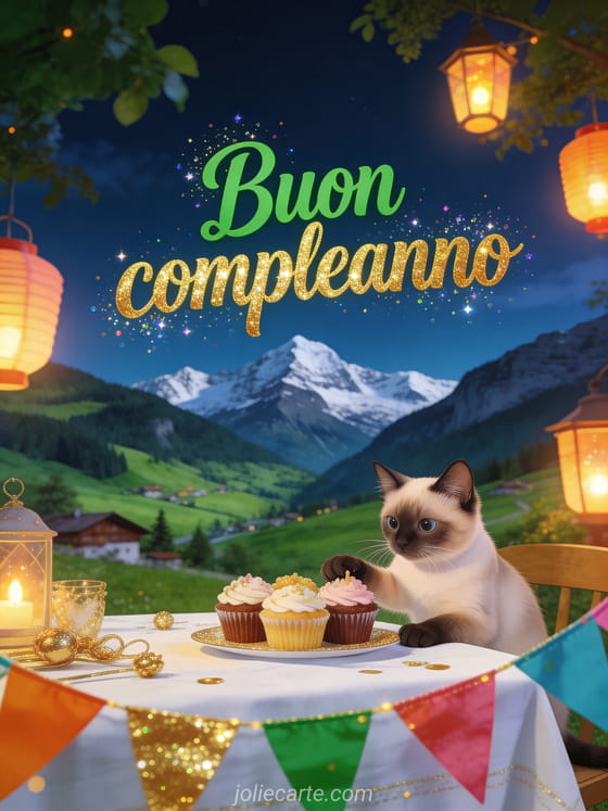 Festeggia con questo biglietto compleanno bambino gratis con un dolce gatto siamese a un tavolo festivo con cupcake, bandierine colorate, lanterne e una valle alpina luminosa sullo sfondo. Scopri anche striscione buon compleanno bebè, buon compleanno bebè gif e biglietto buon compleanno bebè.