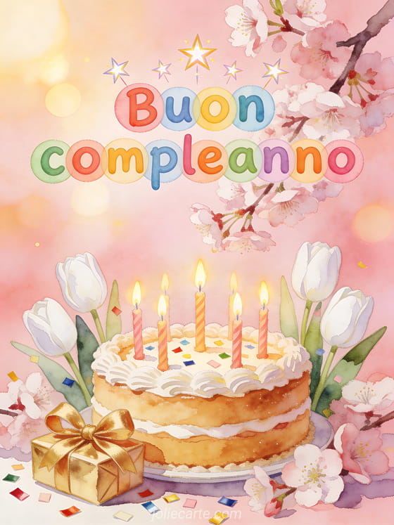 Invia un messaggio di compleanno pieno di colore con questo biglietto festivo con torta e fiori. Puoi anche vedere biglietto compleanno bambina gratis, messaggio testo compleanno bambino o bel biglietto virtuale compleanno bambino.