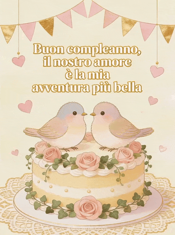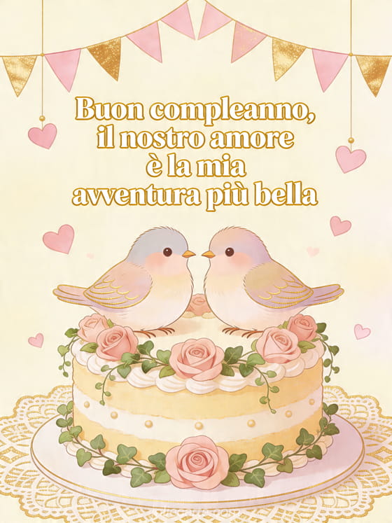 Celebra l'amore con questa cartolina romantica di compleanno con due tortore su una torta decorata, rose, cuori sospesi e festoni dorati. Puoi anche scoprire buon compleanno amore mio, buon compleanno amore mio testo toccante a distanza o cuore cuore buon compleanno amore mio.