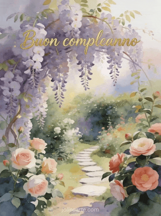 Invia un delicato biglietto di compleanno ad acquerello con un lussureggiante giardino fiorito con glicini, rose e camelie lungo un sentiero di pietra. Scopri anche fiori compleanno donna o compleanno donna umorismo.