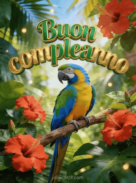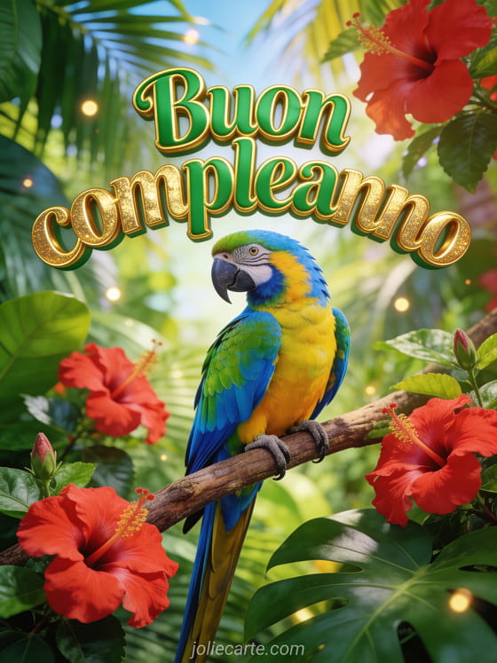 Invia un biglietto di compleanno vibrante con un pappagallo ara multicolore appollaiato su un ramo tropicale con fiori di ibisco. Scopri anche gif animate compleanno donna o gif buon compleanno donna.
