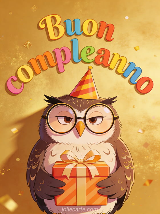 Invia un biglietto di compleanno divertente con una civetta con grandi occhiali tondi e un cappellino da festa che tiene un regalo. Scopri anche un messaggio per compleanno donna o un biglietto compleanno donna elegante.