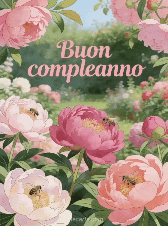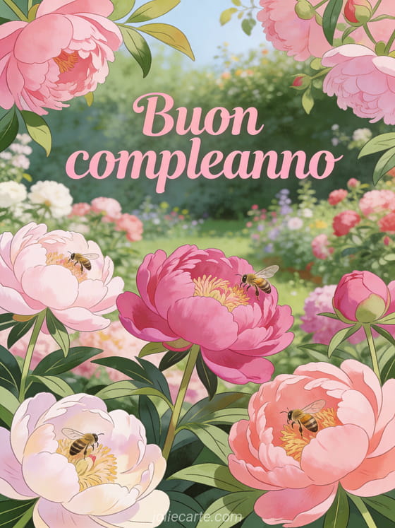 Illumina il suo giorno speciale con questo bellissimo biglietto di compleanno con un giardino di peonie lussureggianti in piena fioritura, dal rosa pallido al fucsia, con api che ronzano tra i fiori. Scopri anche gli auguri di compleanno donna o una proverbio compleanno donna.
