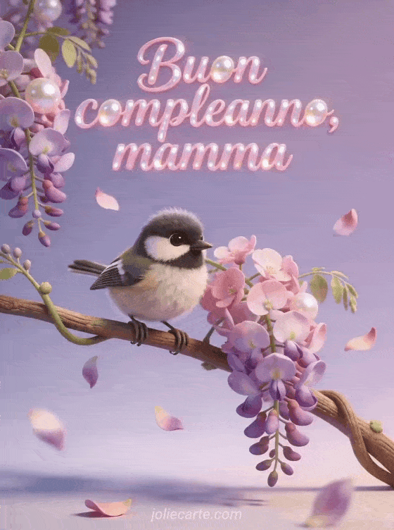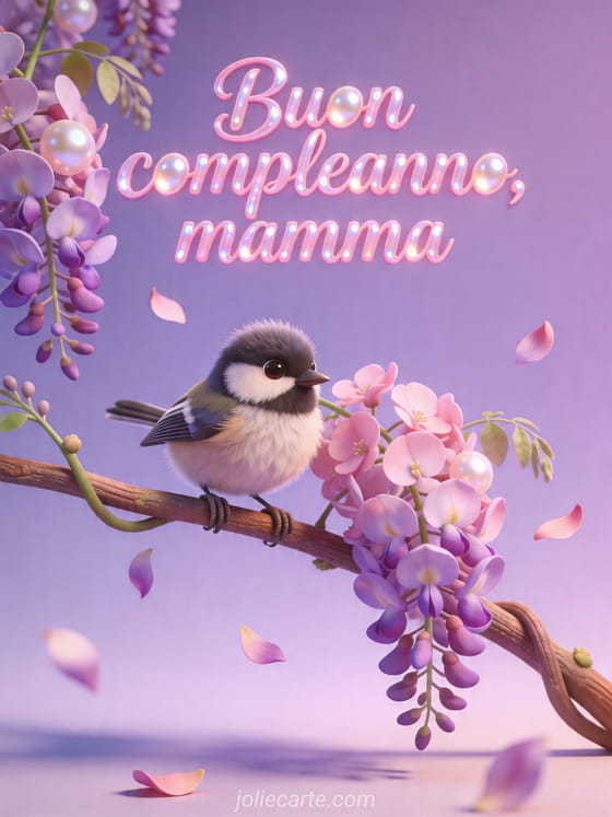 Condividi un dolce augurio di compleanno per la tua mamma con questo tenero biglietto con una piccola cinciarella su un ramo di glicine in fiore con petali che cadono. Scopri anche buon compleanno mamma, testo compleanno mamma commovente e disegno compleanno mamma.