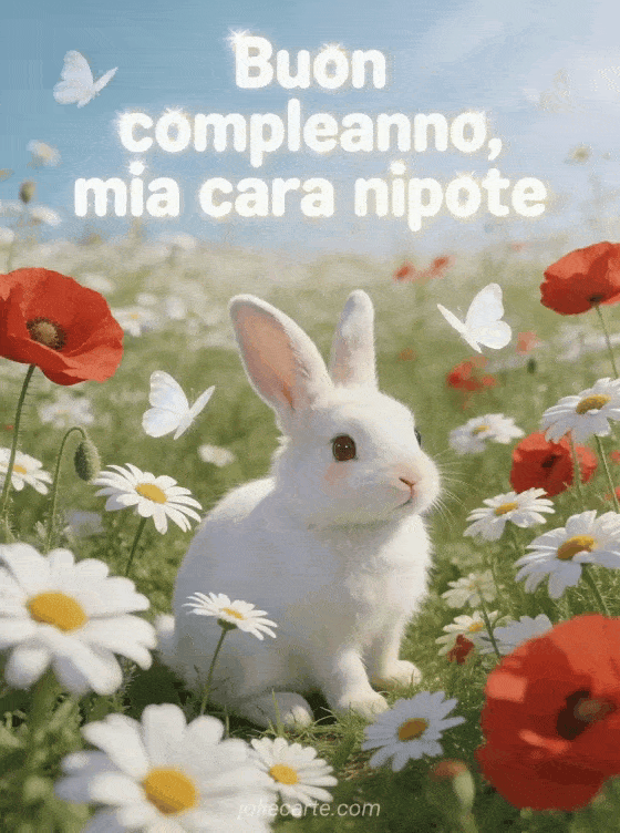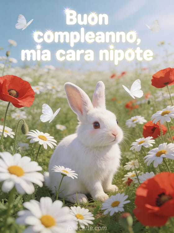Invia un biglietto dolce di compleanno per la tua cara nipote con un piccolo coniglio bianco seduto tra margherite e papaveri, circondato da farfalle bianche nella luce di primavera. Scopri anche compleanno nipote o buon compleanno mia nipote biglietto.
